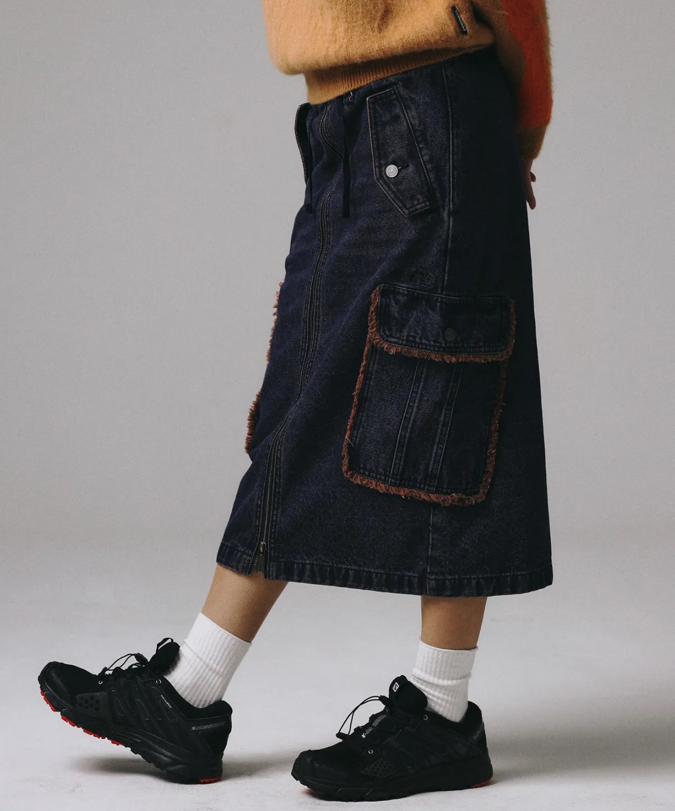COLOR WASH POCKET DENIM SKIRT DARK BROWN