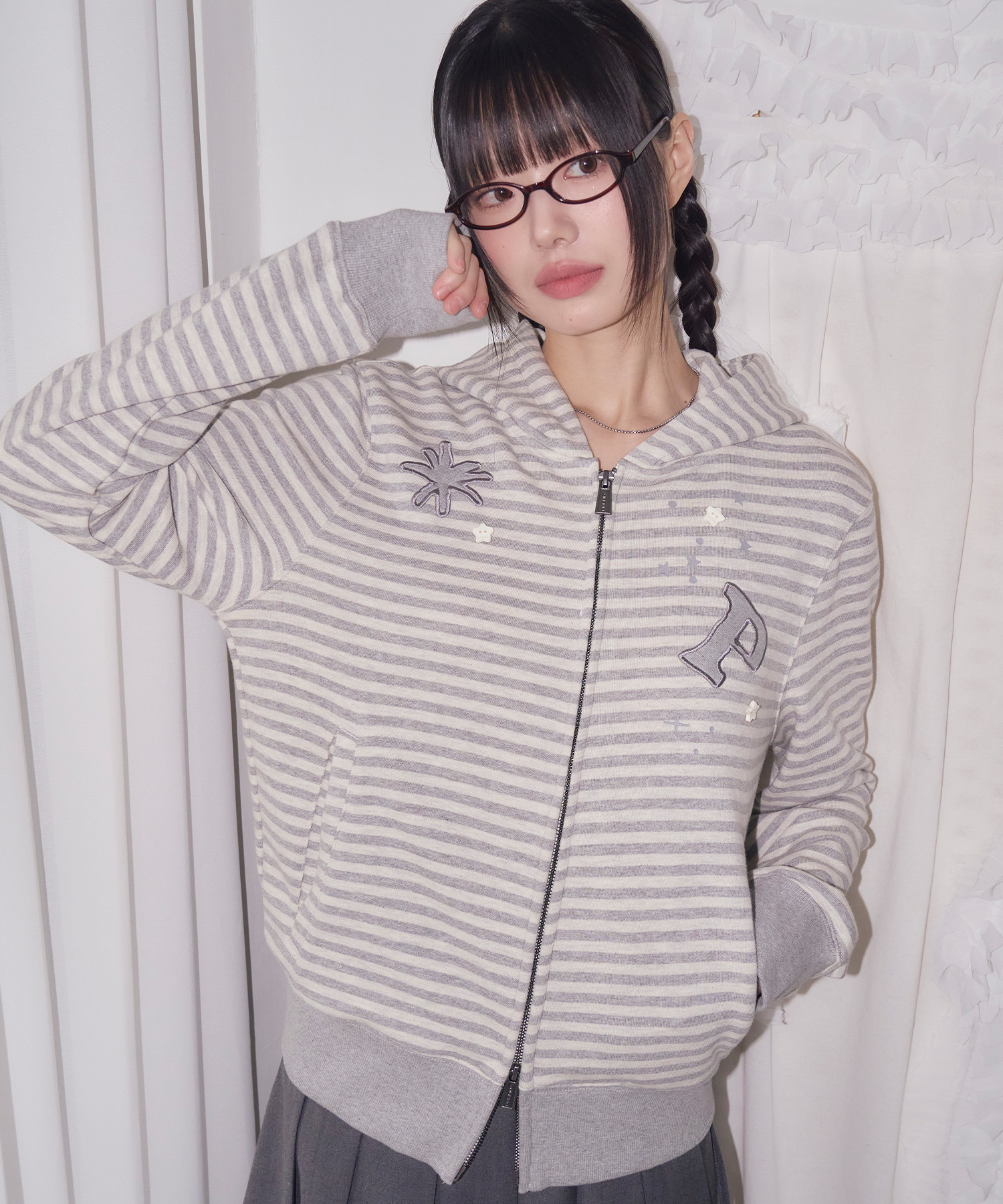 STRIPE STAR BUTTON HOOD ZIP-UP GRAY