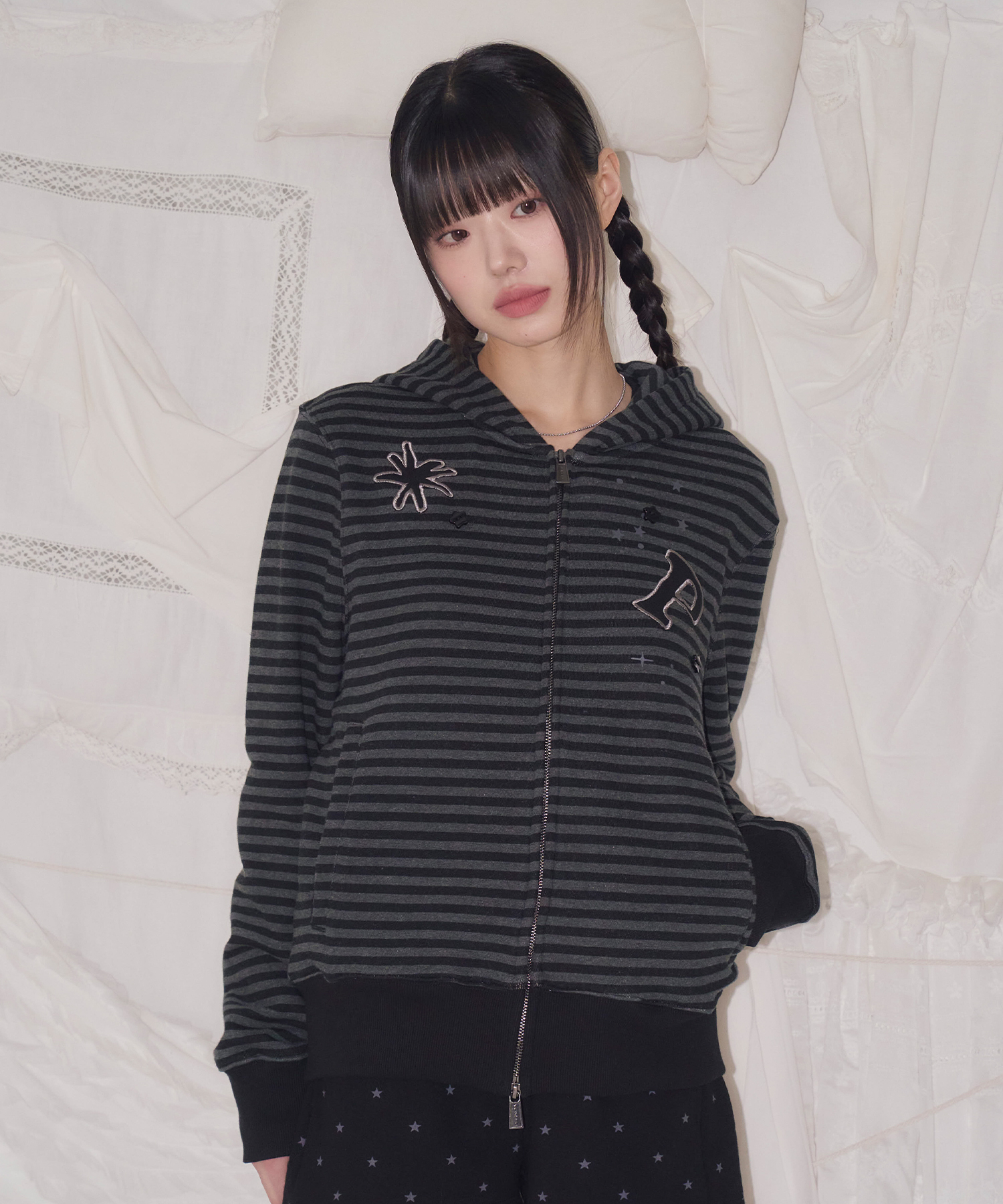 STRIPE STAR BUTTON HOOD ZIP-UP BLACK